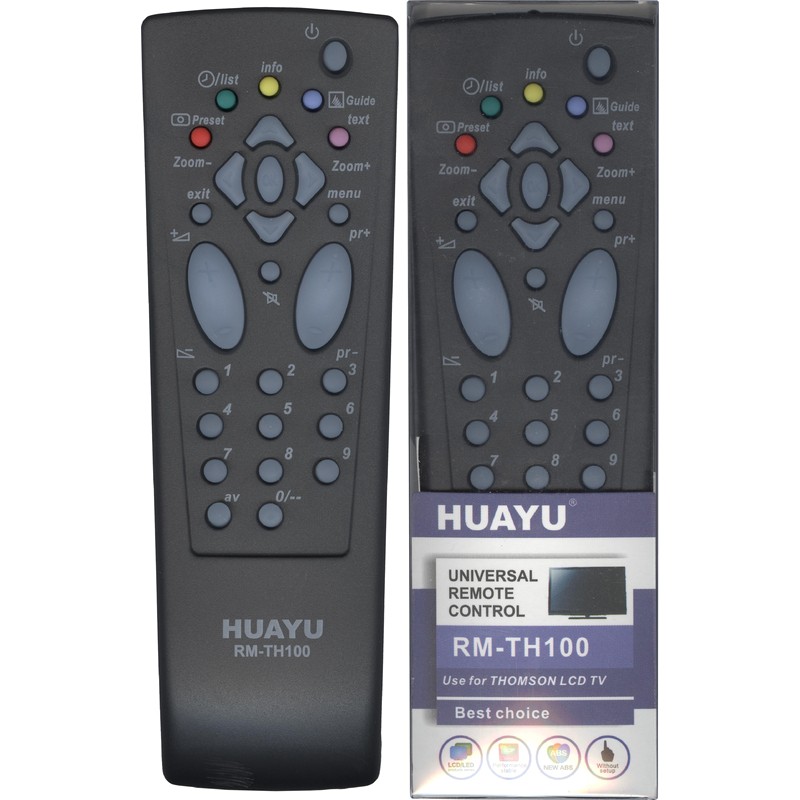 Универсальный пульт Huayu для Thomson RM-TH100 – это универсальный пульт, который заменяет множество пультов определенного бренда. В основном эти пульты не требуют настройки, просто вставили батарейки и пользуетесь, но иногда, когда настройка все-таки необходима, она сводится к нажатию всего двух клавиш. Из чего можно сделать вывод, что им могут пользоваться даже люди далекие от электроники. Его корпус очень часто совпадает с корпусом вашего родного пульта, поэтому у вас не будет привыкания к расположению на нем кнопок. Все они находятся на привычных местах.